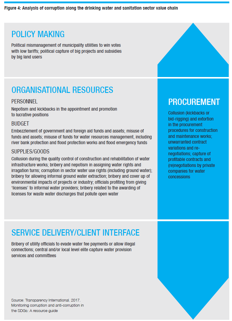 As with other public services, corruption can occur at all stages of the water supply chain, from policy formulation to the management of organisational resources and to the point of service delivery.
